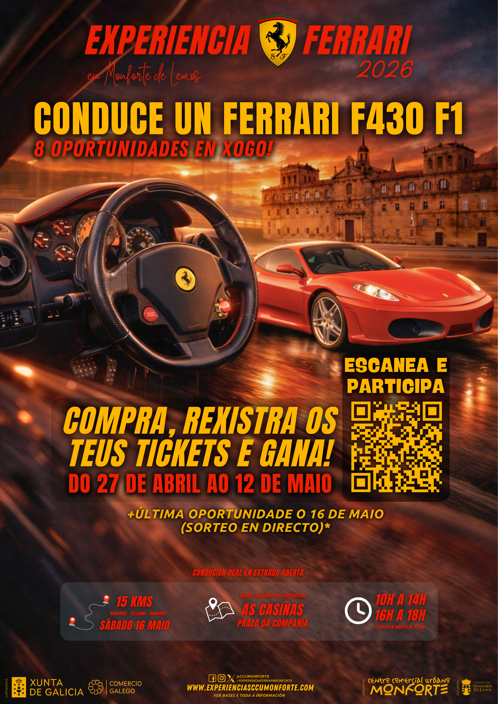 Dentro das campañas de dinamización comercial deste ano, o Centro Comercial Urbano (CCU) de Monforte propón unha experiencia única: a posibilidade de conducir un Ferrari F430 F1 en estrada aberta.
